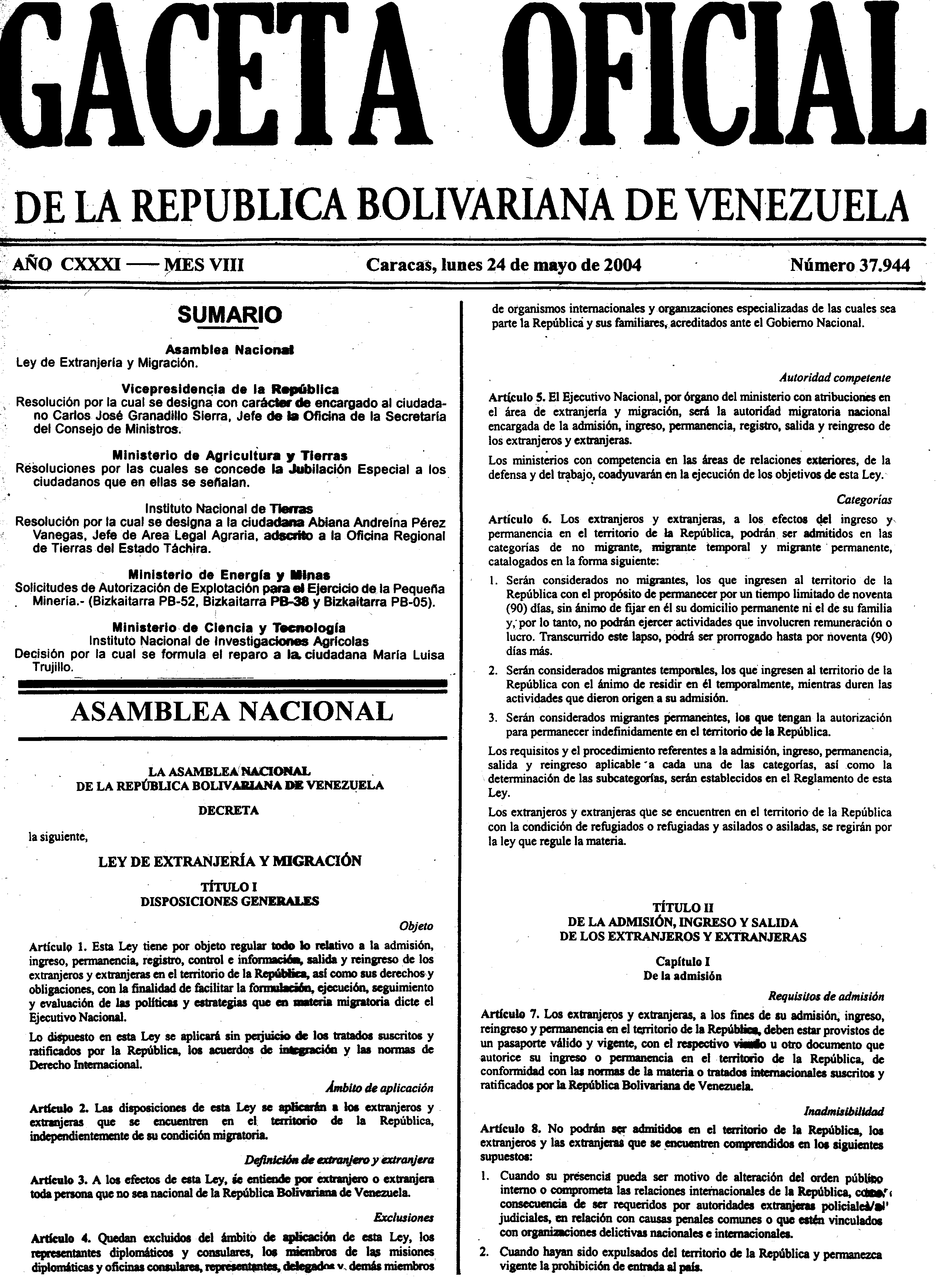 AÑO CXXVII MES V -- Caracas, Lunes 24 de Mayo de 2004 -- Número 37.944